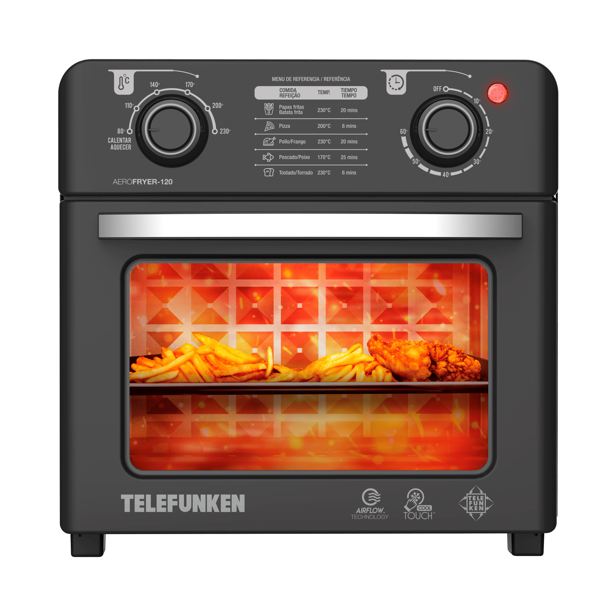 Fritadeira sem óleo por ar quente TELEFUNKEN AeroFryer 120 – Controle frontal, prático, 12L de capacidade e potência de 1500-1750W com 2 posições de cozimento, 3 bandejas incluídas e 3 funções de cozimento: fritar, tostar e aquecer.