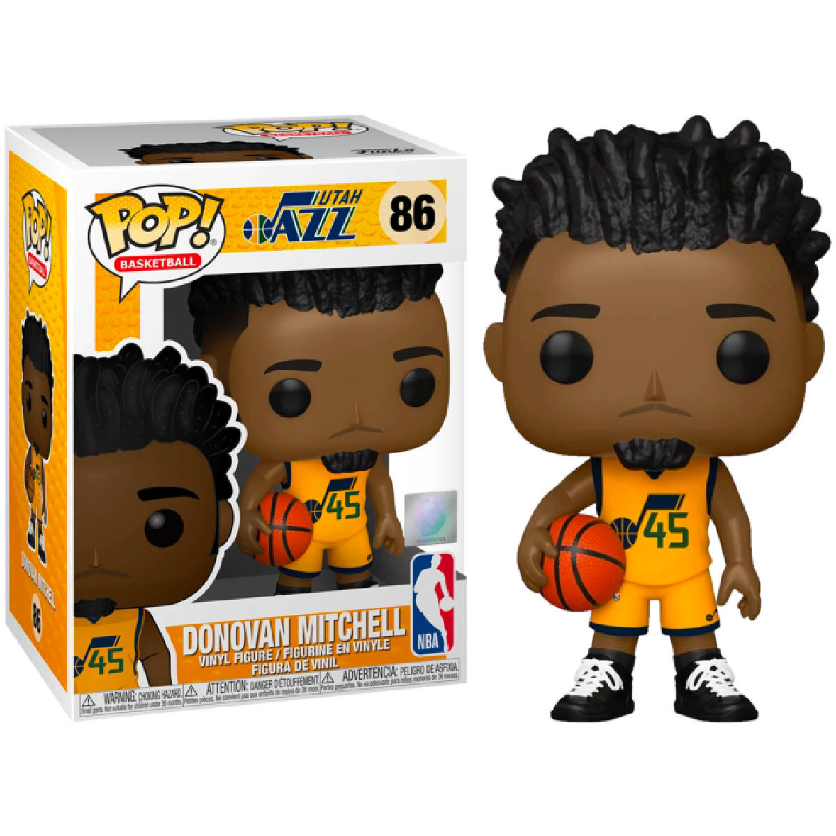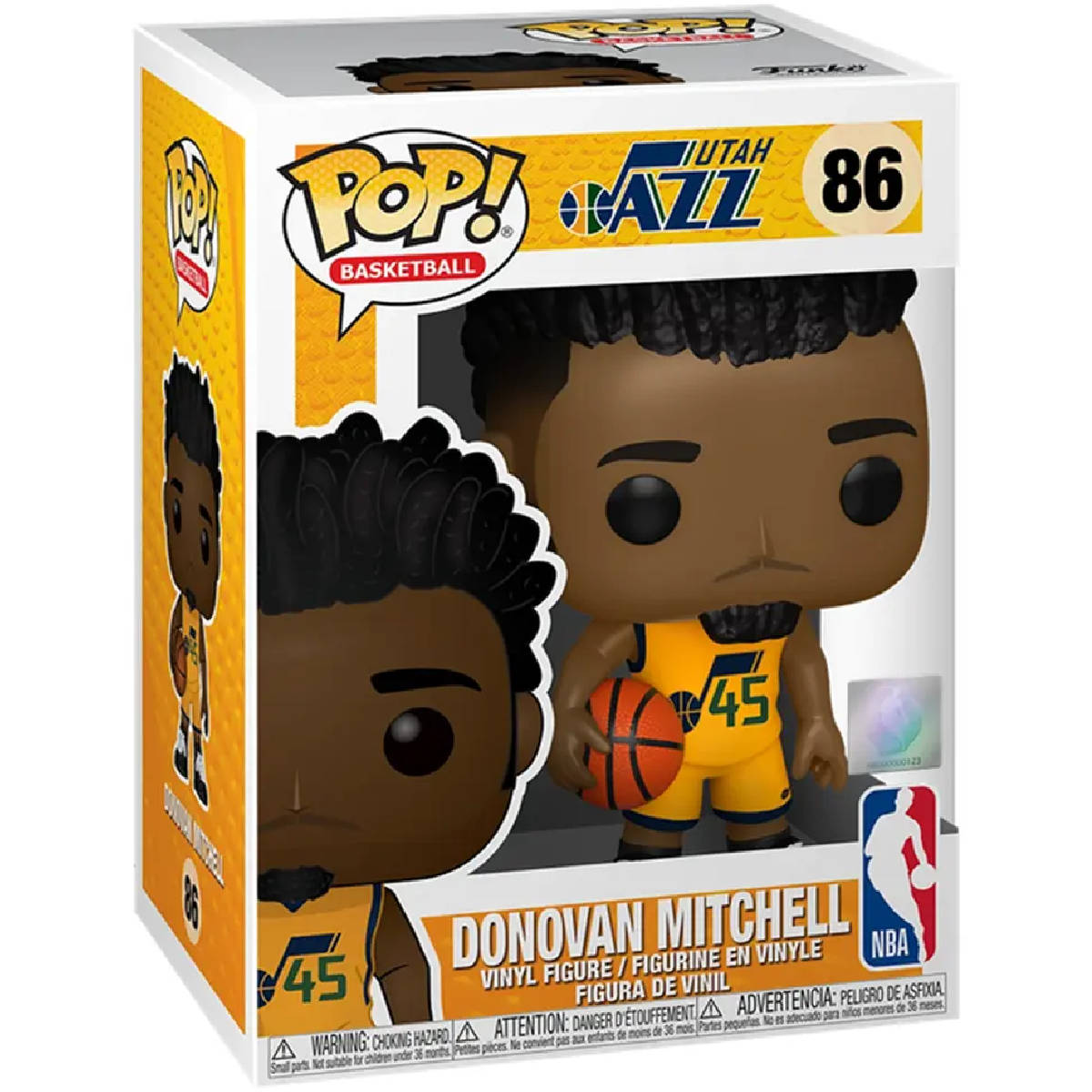 Este Pop! estilizado apresenta o jogador de basquete da NBA Donovan Mitchell vestindo sua camisa de jazz alternativa.