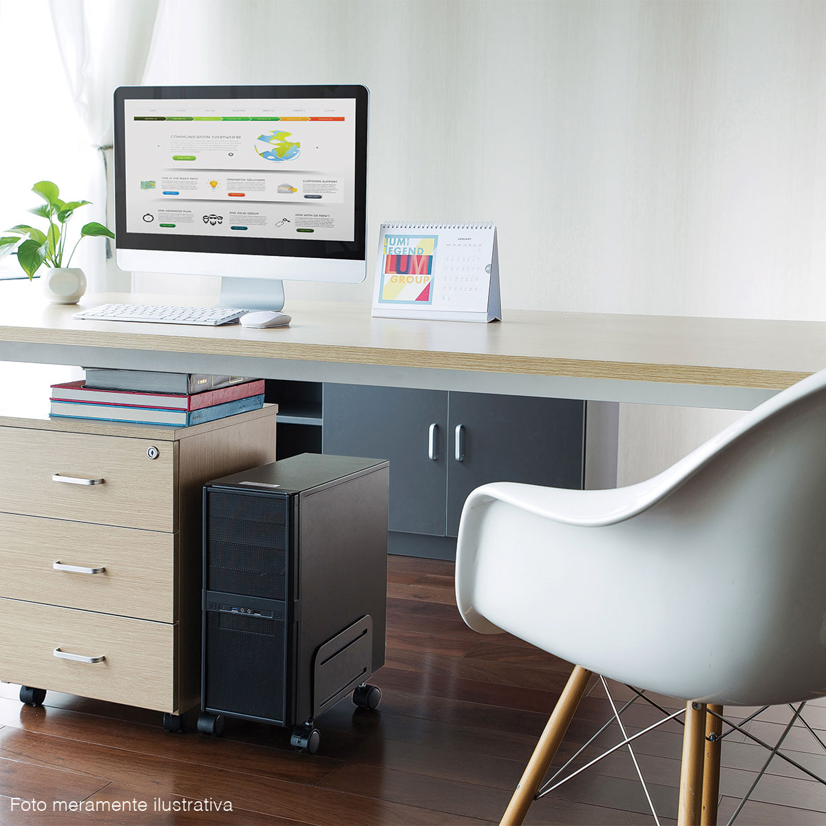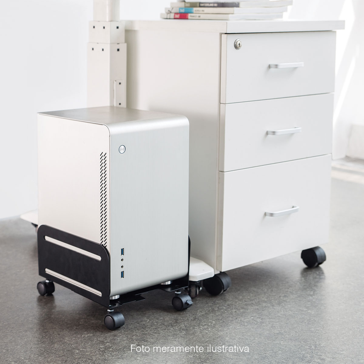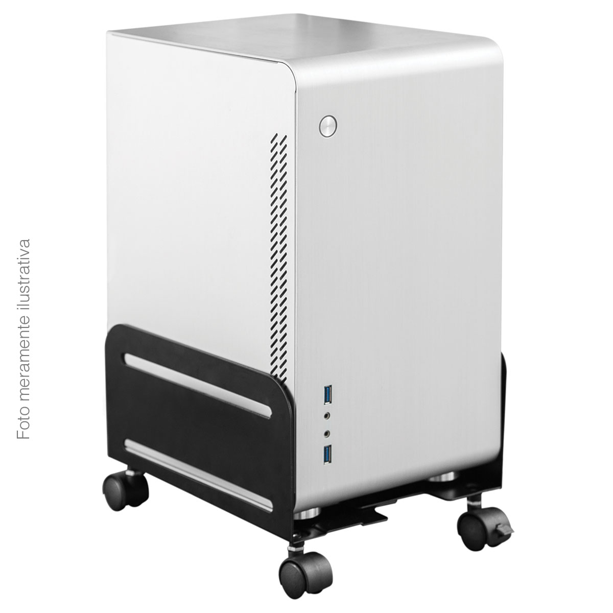 Com 4 rodas, sendo dois traváveis que impedem que o suporte deslize, o gabinete pode ser facilmente transportado.